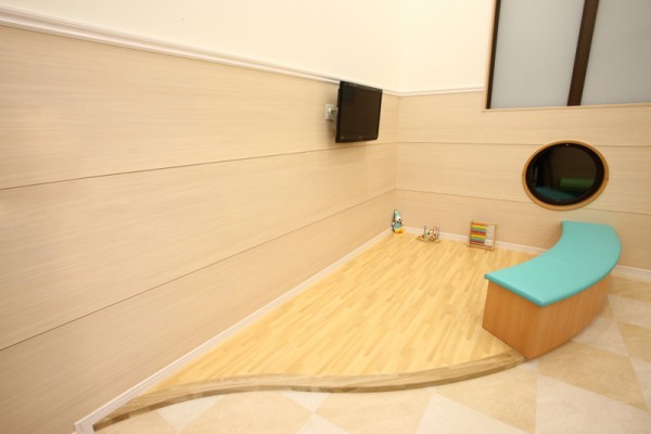 点滴ルームはお子さんだけでなく、保護者の皆さんも少し休めるように、ベッドではなくクッショ ンフロアにしています。お子さんと一緒にお休みください。また、プレイルーム同様にDVDモニターも設置してます。